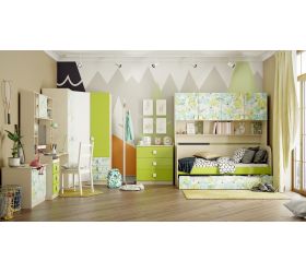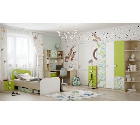 Сочетание разных оттенков зеленого, нежно-голубого и белого глянца в этом комплекте помогает добиться гармонии и спокойствия. При этом забавные рисунки необычных птиц и цветов добавляют нотки озорства, так свойственного всем детям.
