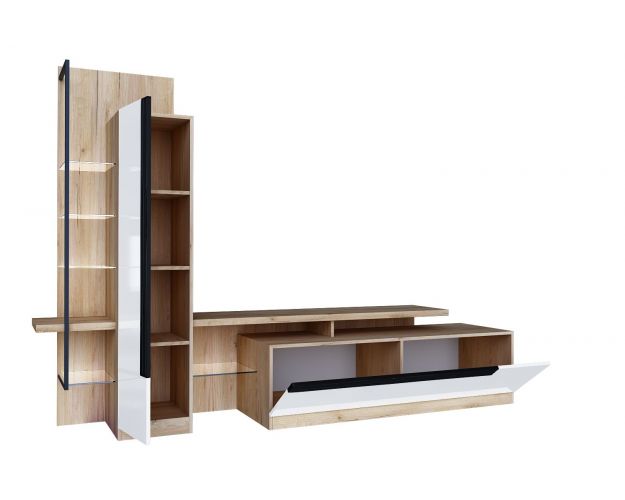 - Модуль скомбинирован из шкафа с открытыми и закрытыми полками, тумбы и полки под ТВ.